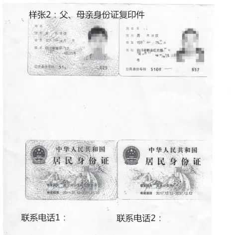 2、适龄儿童父母(或其法定监护人)的身份证)(查验原件,递交复印件,复印件上写下联系电话),如下图所示: