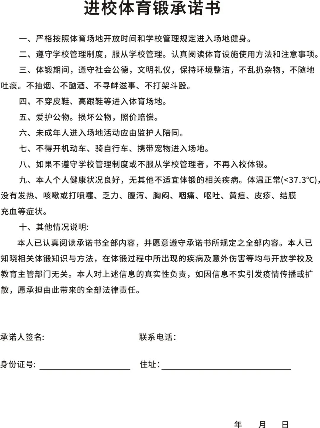 (二)入校人员须主动签订《市民进校体锻承诺书》,并自觉遵守学校管理规定,对于不遵守学校管理规定产生不良影响的入校人员,学校有权按规定禁止其入校。