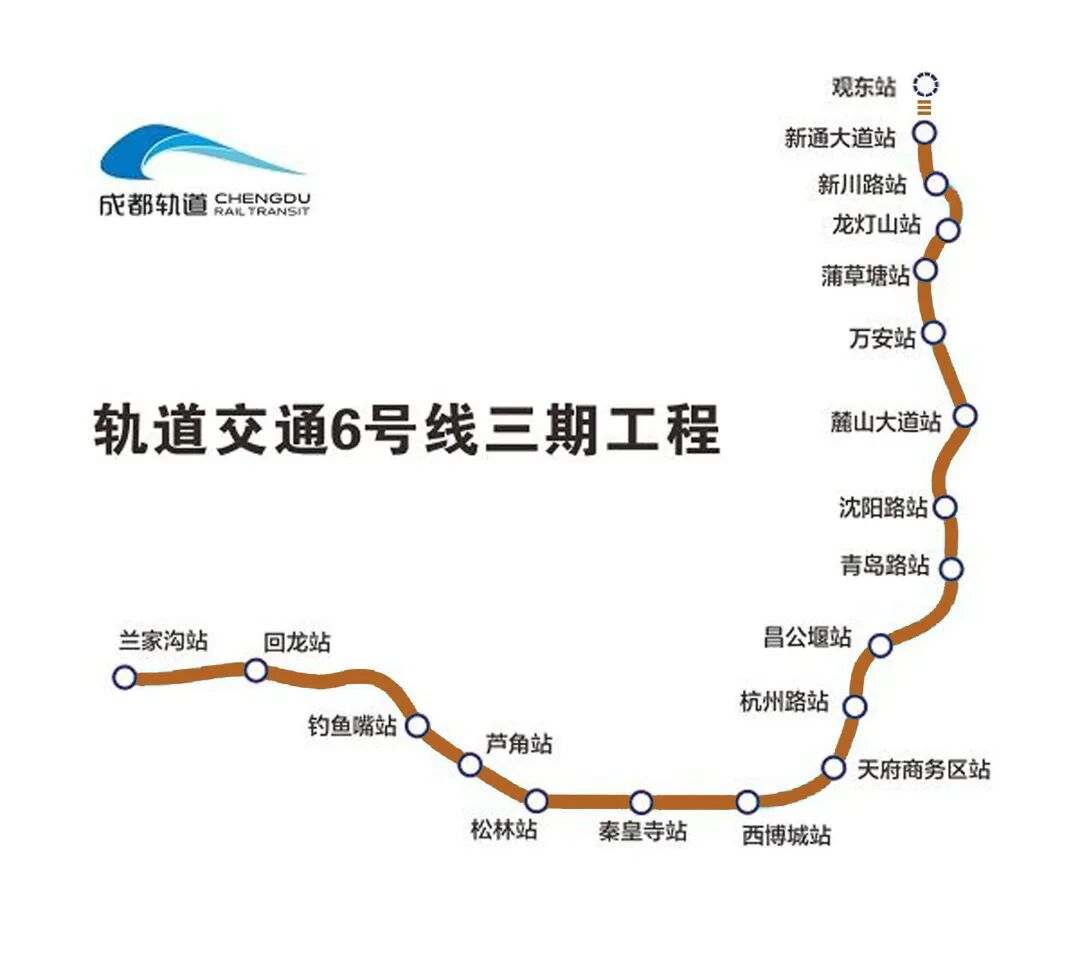 6号线三期起于观东站(不含),途经高新区、天府新区、至双流区,整体呈“L”型走向,止于兰家沟站(含),全长约22.08公里,全线设站18座(含已在建西博城站),均为地下敷设。三期工程作为6号线一二期工程的延伸线,串联了天府新区核心地块并与1、5、18号线以及后期规划线换乘。