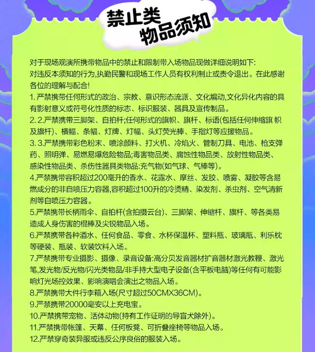 ·由于安保和版权的原因,大多数演出、展览及比赛场所禁止携带食品、饮料、专业摄录设备、打火机等物品,请您注意现场工作人员和广播的提示,予以配合