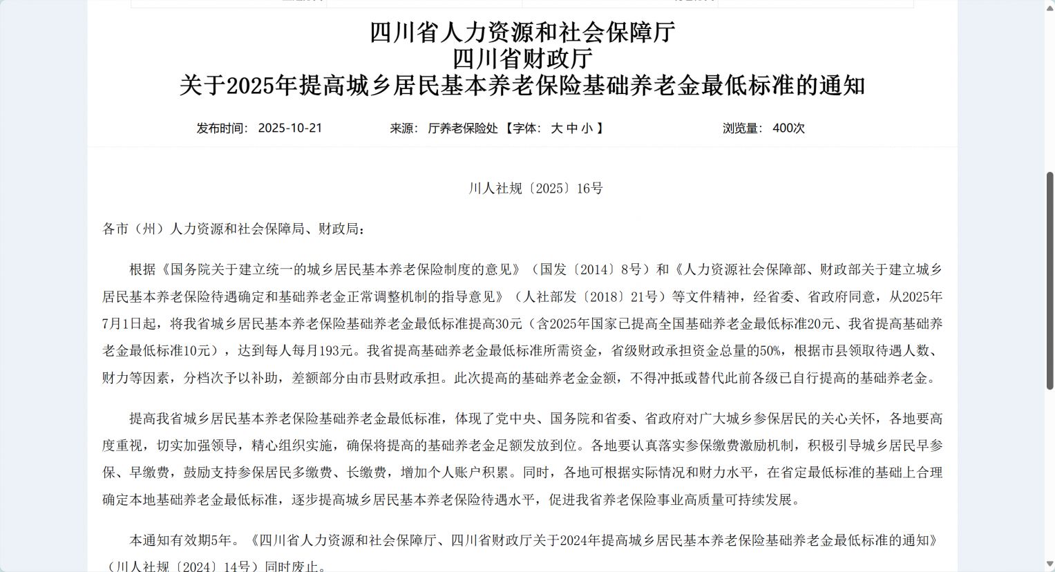 日前,四川省人力资源和社会保障厅、四川省财政厅发布关于2025年提高城乡居民基本养老保险基础养老金最低标准的通知。