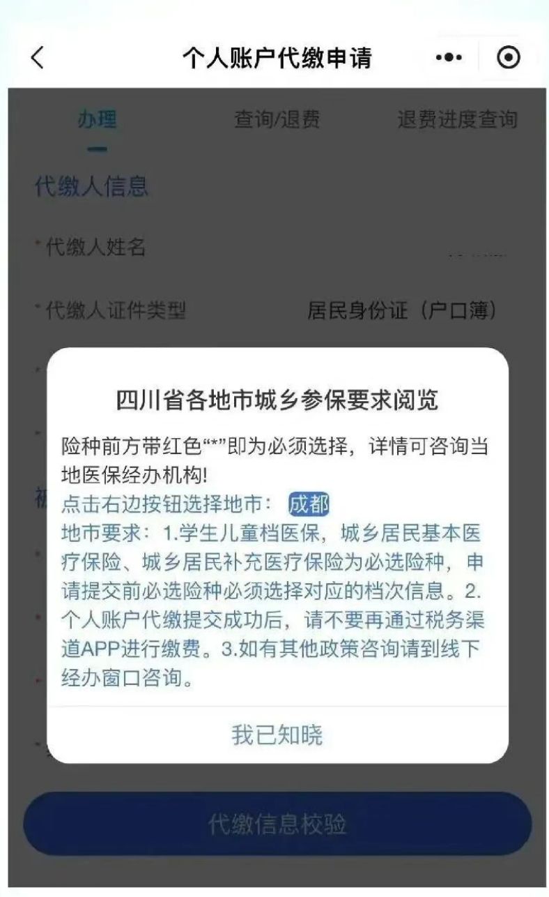 进入 “个人账户代缴申请” 界面,阅读四川省各地市城乡参保要求(带红色 “*” 为必选,可咨询当地医保经办机构),点击 “我已知晓”。